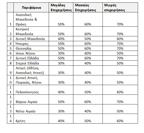 Μέχρι 75%, με βάση τον Χάρτη Περιφερειακών Ενισχύσεων, ανάλογα με το μέγεθος της επιχείρησης και την περιοχή εγκατάστασης.